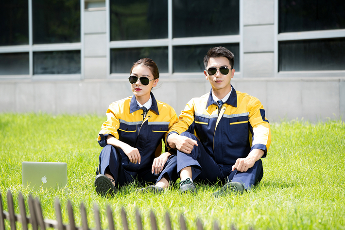 合肥工作服定做款式藏青色拼黄色长袖工作服套装GZ-8015